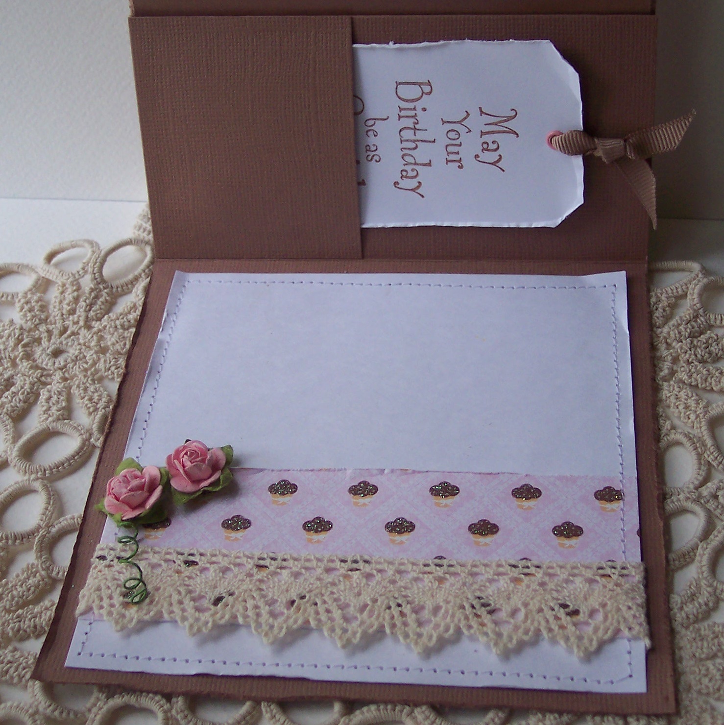 ReplyDeleteYummy - the colors are so luscious. So many wonderful elements to your card. Fantastic sentiment and image - all of the flowers are the perfect embellishments. Love the tag surprise when you open the card. The lace is the perfect addition for our Digi Design House challenge, thanks so much for joining us!