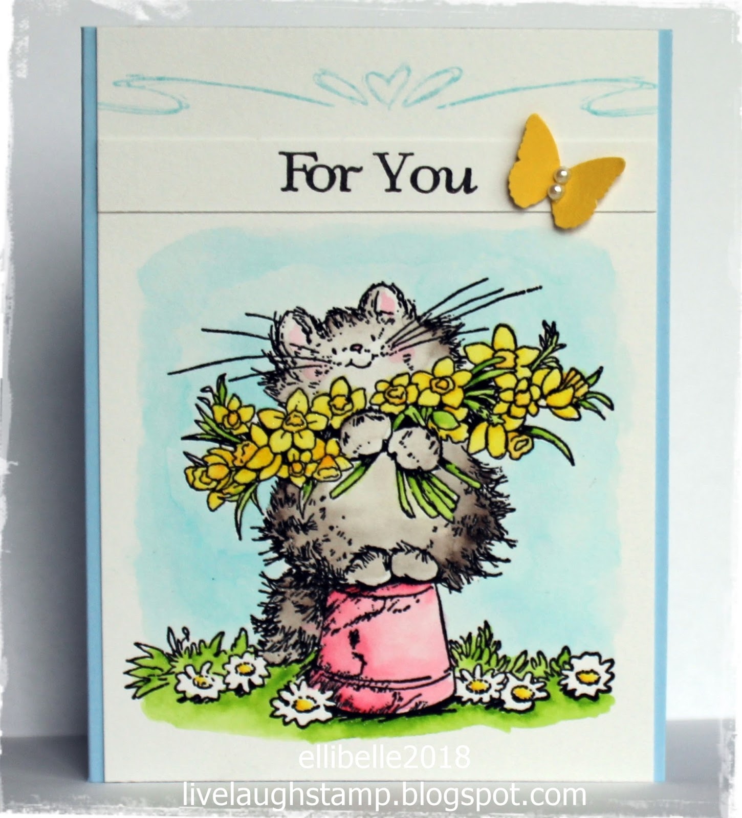 Your kitty with his arms loaded with flowers is so refreshing after a long winter! He's adorable. Thank you for entering your card in our challenge this week at The House That Stamps Built.