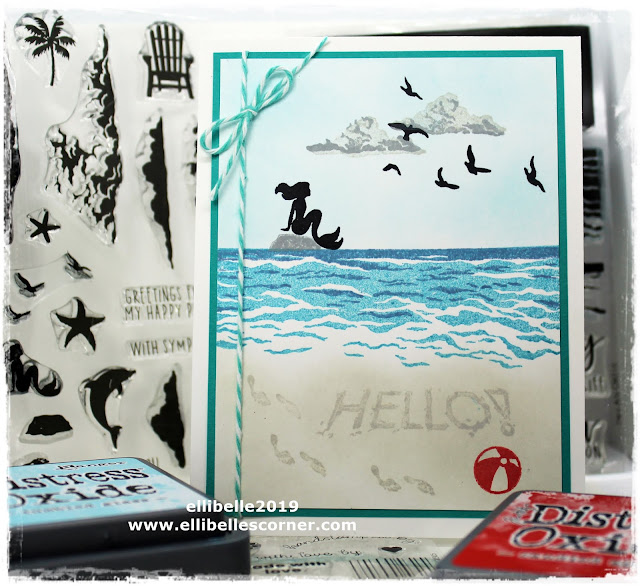Unfortunately the "Layering Waves" set is currently out of stock. The Layering Sea set is currently still available (as I type this), and this set includes the clouds, sea silhouette images including the cute footprints. I used distress inks Broken China and  Stormy Sk to ink up the waves, then added a post it note over the waves and inked up the sky with Tumbled Glass Distress Oxide. Next I stamped the rock using Hickory Smoke Distress Oxide ink and the Mermaid and birds using Versafine Claire Nocturne Ink. The two step clouds were first stamped with Pumice Stone oxide ink then  Hickory Smoke oxide ink for the second layer. The bottom portion was inked with Pumice Stone ink and I stamped the sentiment which is part of the Layering Waves set and the footprints with Pumice Stone ink as well. The beach ball was stamped using Candied Apple Distress Oxide. (By the way, I wish I had all these inks in Distress Oxide formula, but didn't, so I had to use some regular distress inks (which are great inks for all things watercolor-y but not so great for solid stamping.) Versafine Clairs would have been a great option too, but only have one ink pad in black (nocturn) from the Versafine Clair line of stamps.)