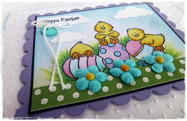 As you can see the card has been kept pretty simple. I just matted the image onto designer paper, added a strip of matching paper and a scallop paper between the sentiment and image. Then I added some white twine and did machine sewing along the edges. A really old, but one of my favorite simple SU flowers was stamped right over the sentiment in a light lilac shade, and I have done the same thing on inside of the card.