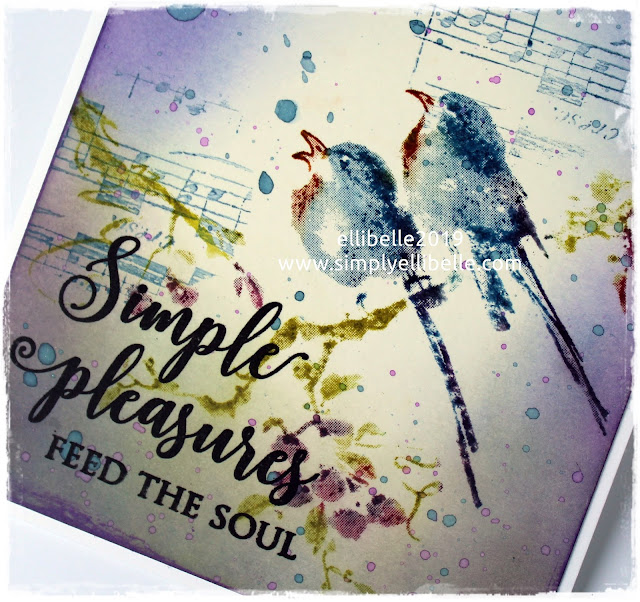 For my card I decided to ink up the Penny Black stamp The Sweetest Sound using Distress Markers, spritzed lightly with water then stamped on to Bristol Vellum Paper using my Tonic Stamp Platform. I used Distress Markers in Faded Jeans, Seedless Preserves, Crushed Olive, Rusty Hinge and Worn Lipstick to color the image directly on the rubber. The card was then inked with Bundled Sage Distress OxideWilted Violet Distress Oxide and Faded Jeans Distress Ink. (I don't have this color in the Oxide formulation, but luckily you can mix and match the formulations.)