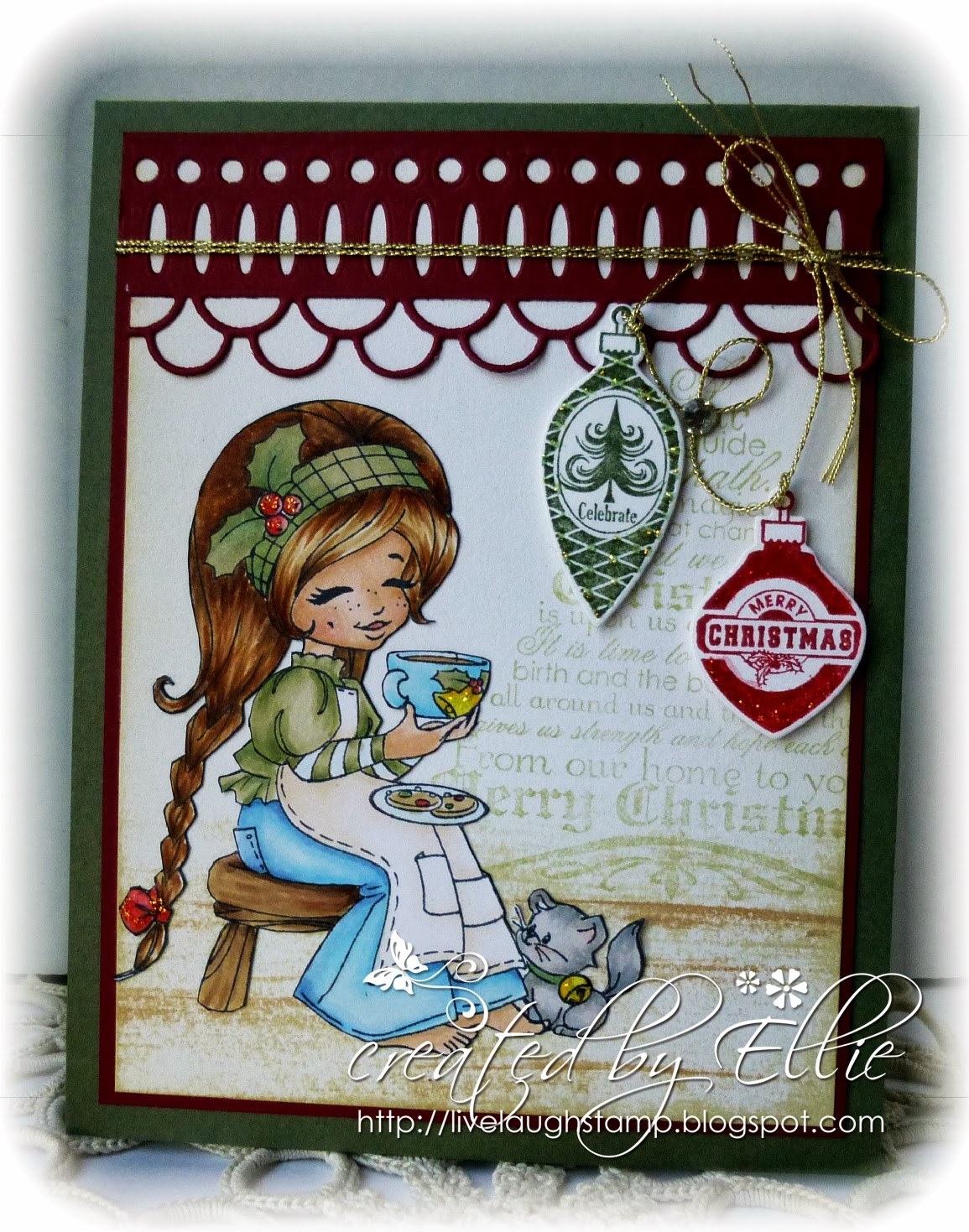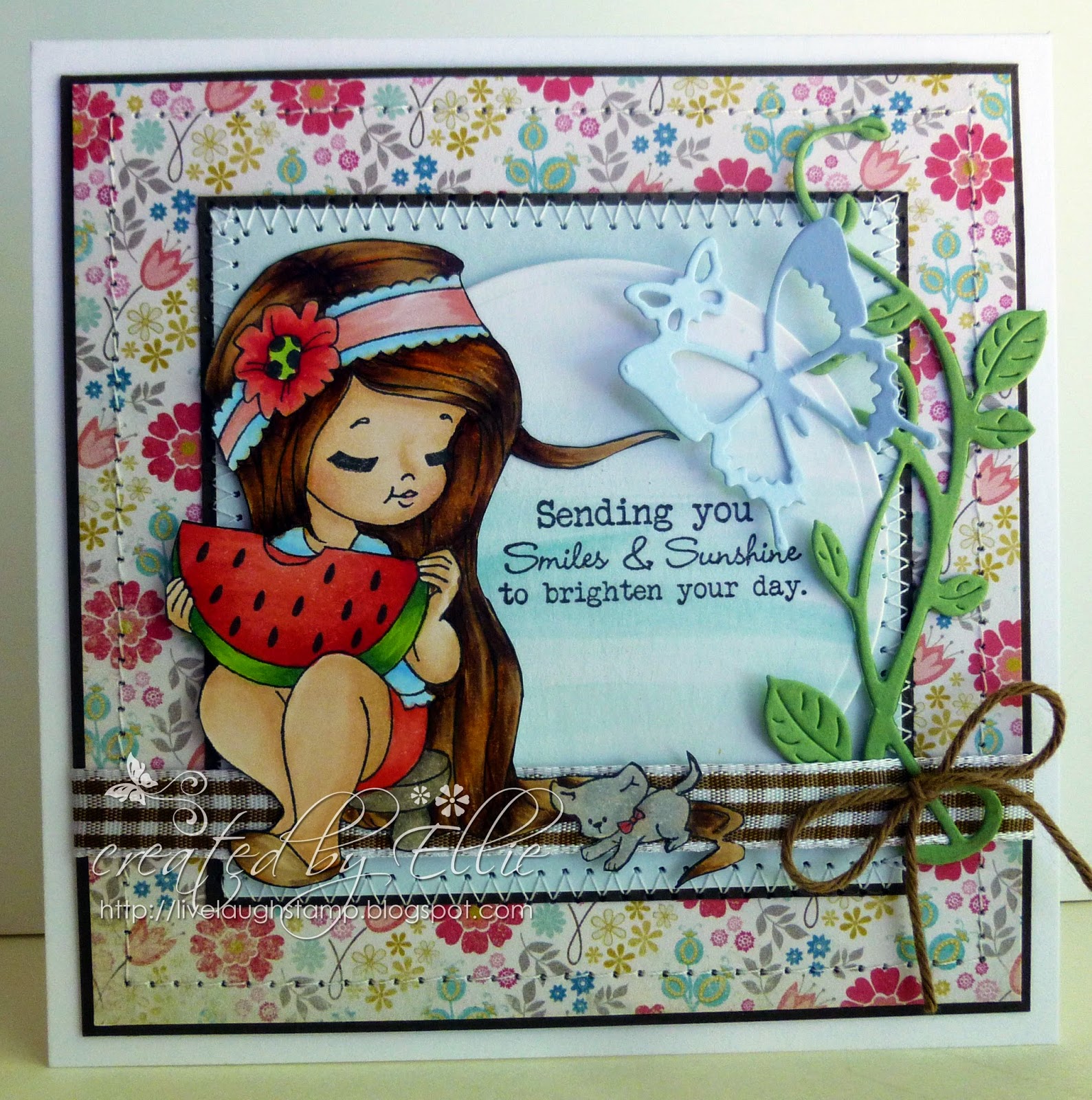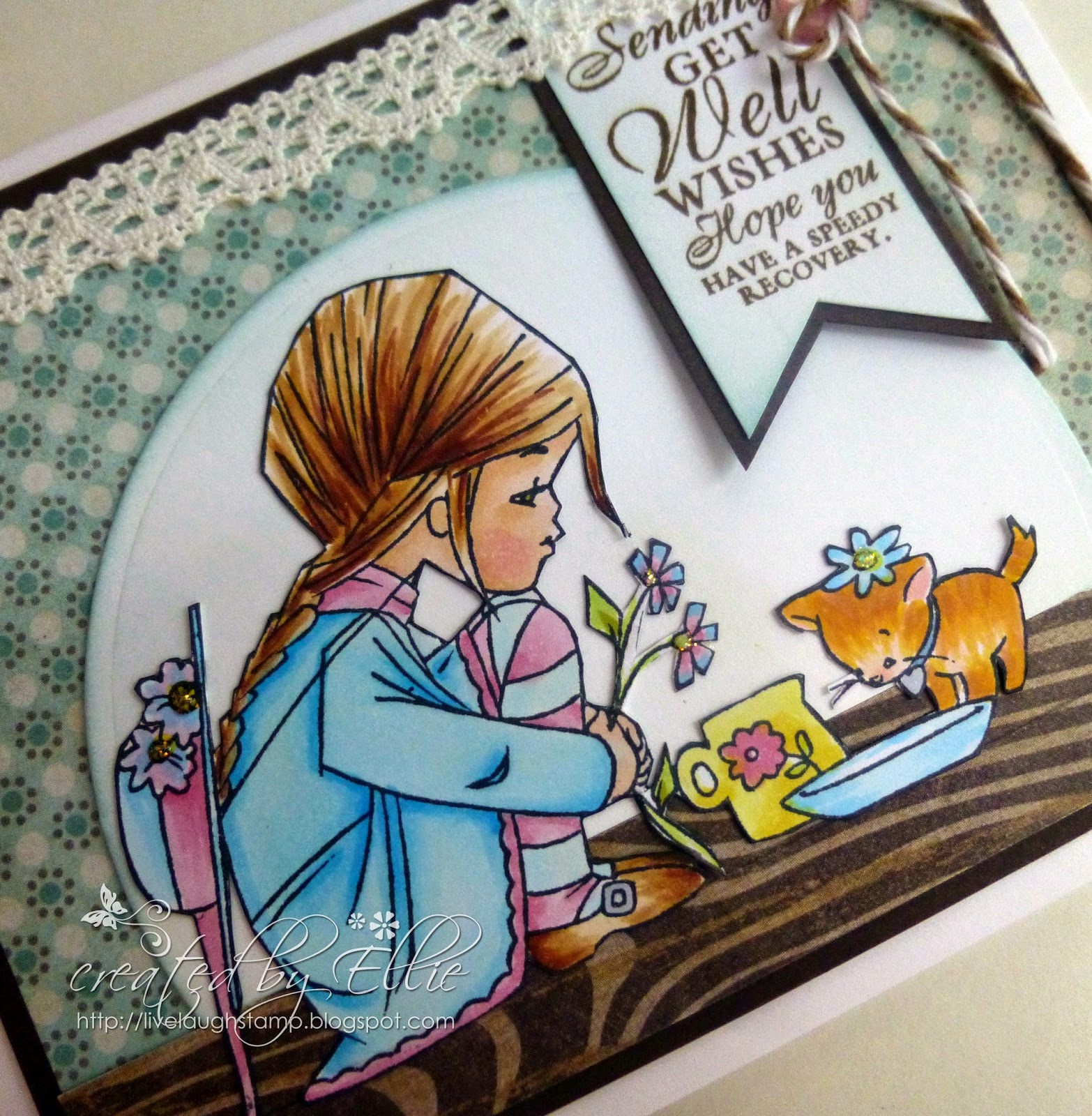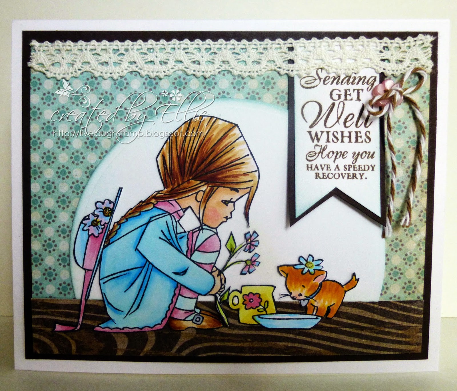 I stamped her with versafine onyx ink on Neenah Solar Crest card stock and coloring was done using Faber Castell Polychromos pencils. The card has been kept simple. I did add a flourish die cut which was done using Whimsy's Vines Die set, along with some silk ribbon and a little flower. Framed it onto some soft coral polka dotted paper and then onto the Mellow Moss card stock. The sentiment is from the set "Everyday Moments", one of my go-to sentiment sets.