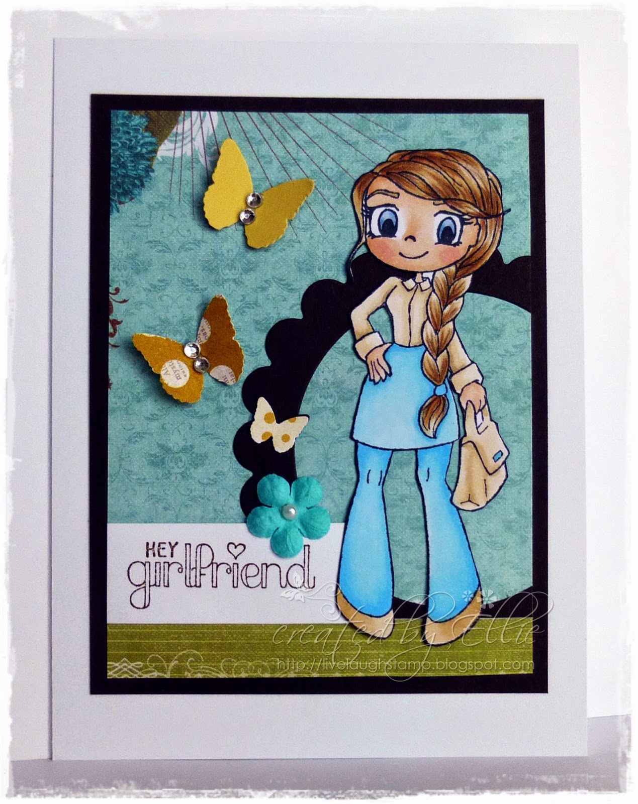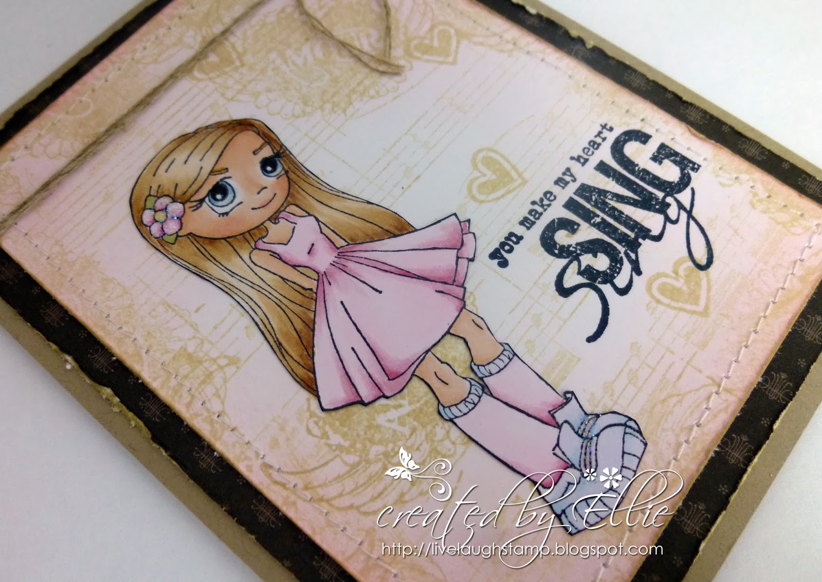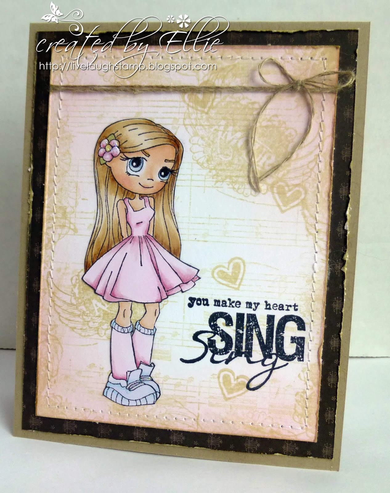 Sentiment is from another favorite Whimsy Sentiment set - Girl Talk. The card is simply embellished with ribbon and twine.