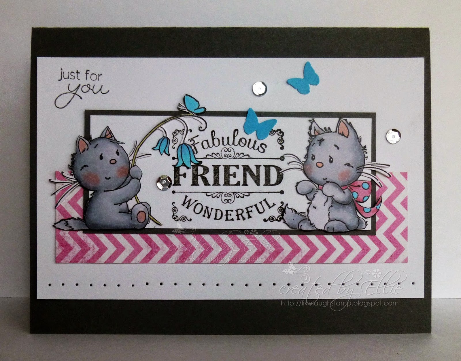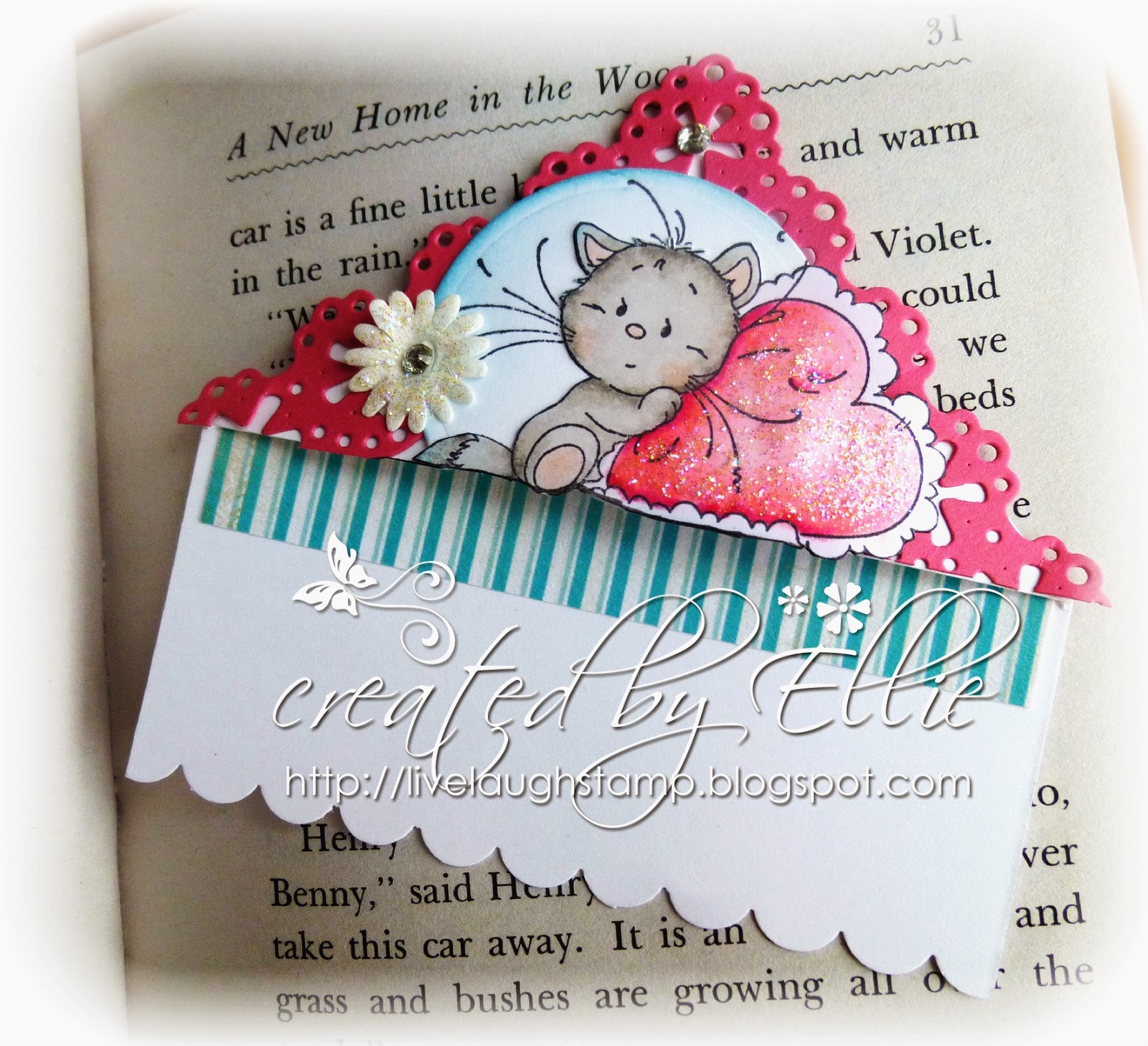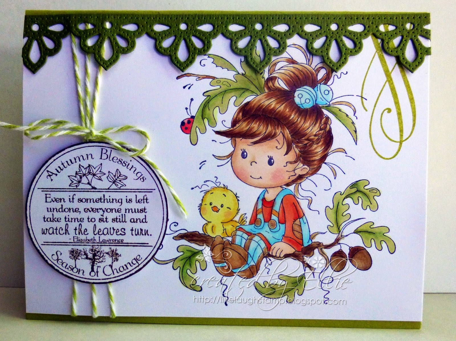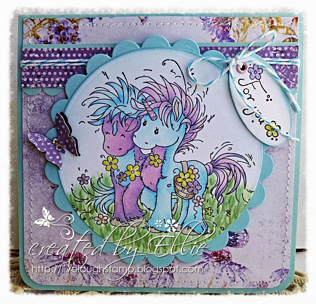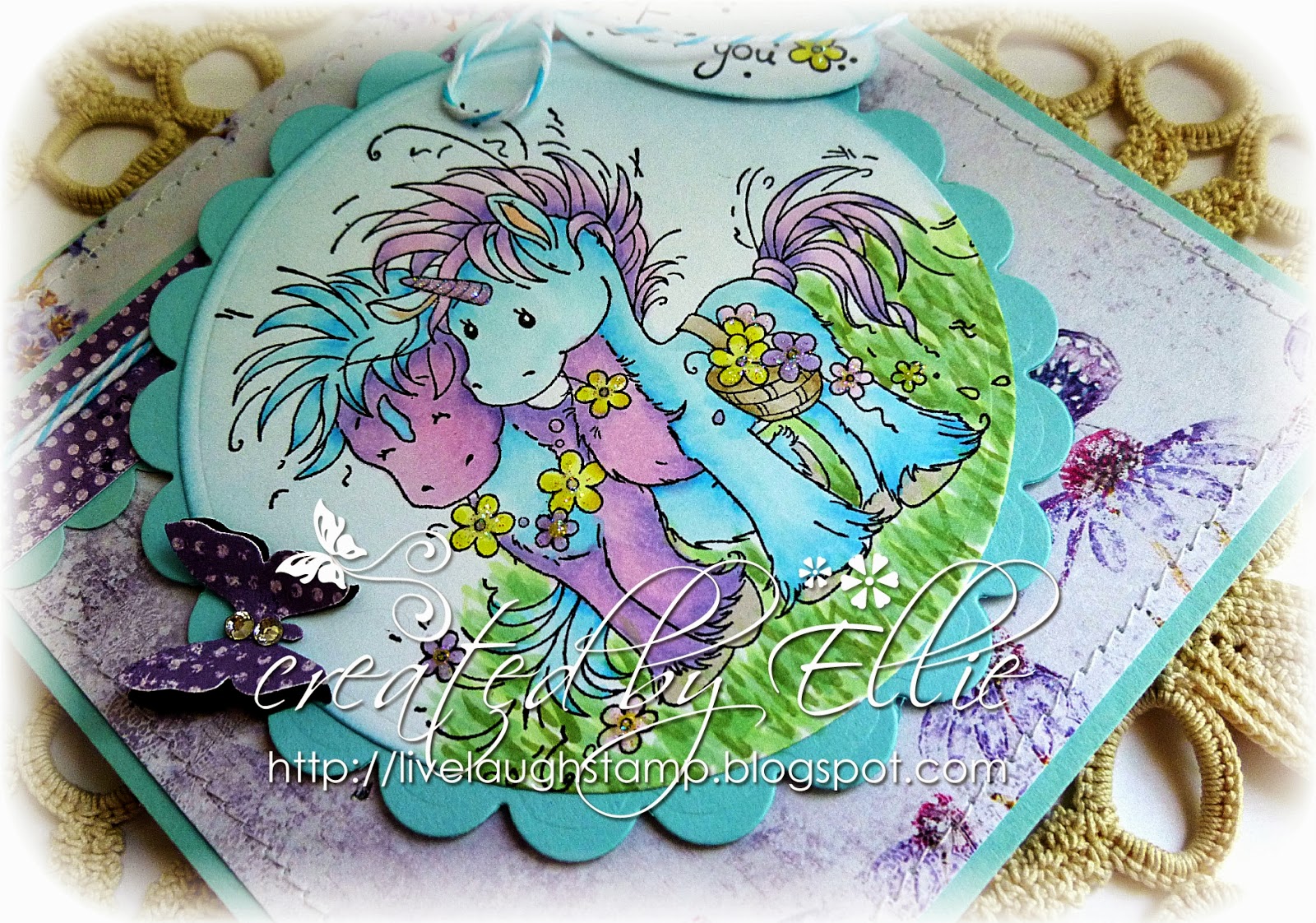Sentiment is part of the Whimsy Stamp set. I embellished with some ribbon and twine and a button.